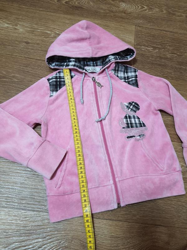 Кофта велюрова. На молнии. Нежно розового цвета, со вставками в клетку. Двойной капюшон.
