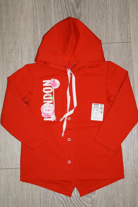 Стильна червона парка для дівчинки. Розмір 110. Склад тканини: 100% бавовна. Має оригінальний крій з подовженою спинкою, застібається на акуратні закриті кнопочки. Доповнена капюшоном. Виміри: Довжина 48 см Напівобхват грудей 32 см Довжина рукава 34 см Стан новий. Купували для своєї дитини, але не носили.