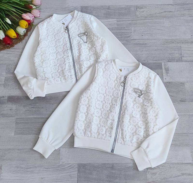 🧡В наличии 🧡 Нарядна кофта для красунь тканина трикотаж двухнитка + спереду вставка макраме застегивается на молнию, брошка в комплекте ЦВЕТ Молочный Цена 625 грн замеры: длина/пог/рукав от плеча 122-39/38/43 128-41/40/46 134-43/41/47 140-44/41/52 +-2см 122-2шт 128-2шт 134-2шт 140-1шт арт,4 Детская одежда