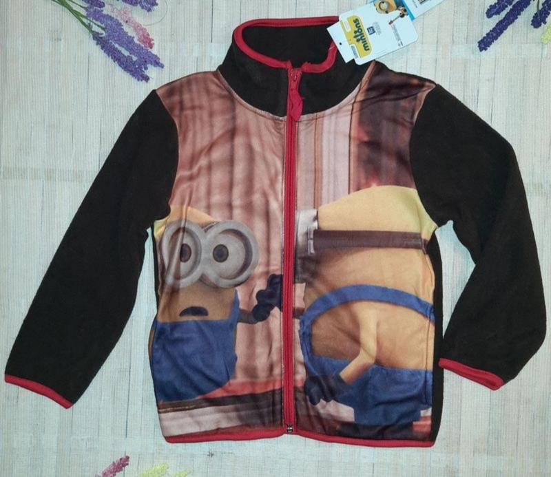 Флісова кофта/толстовка з Міньйонами від Illumination. Фліс не товстий. 100% поліестер Вік вказаний 6 років на зріст 116 см. ЗАМІРИ У СПОКОЙНОМУ СТАНІ: Ширина у плечах – 34 см Ширина в грудях (під рукавами) 37 см Довжина плеча від горловини/коміра - 8,5 см. Довжина рукава від плечового шва-39,5 см Довжина виробу по спині по центру 45 см Відправлю Новою поштою або Укрпоштою за повною передоплатою на картку Приватбанку. Наклад.платіж можливий лише Новою поштою з передоплатою за доставку в обидві сторони у розмірі 140 грн (автоматично віднімається із загальної суми).