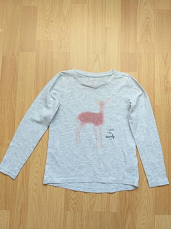 светло-серого цвета, рисунок- олененок, длиннее спинка. Размер 116 длина спереди 39см (сзади 42см), ширина 31см, плечи 24см, длина рукава 41см