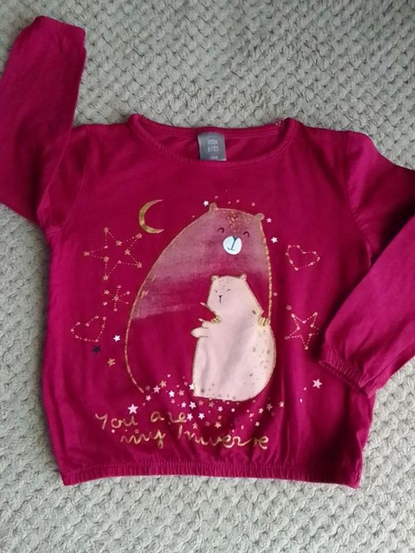 Базова кофточка насичено бордового кольору з ведмедиками, рукава в низ на гумочці. Вказано розмір 104. Довжина 33 см., довжина рукава 32 см., ширина плечей 25 см.