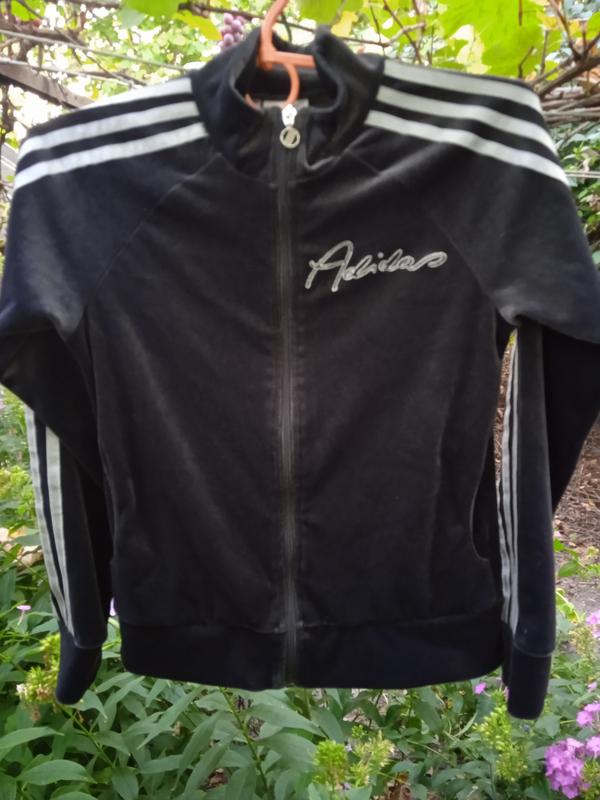 Актуальна кофта Adidas велюрова колір темно-сірий логотипи, номерний, є Qr-код бирочки новенькі мінімально притертий велюр внизу біля замочка довжина 155 см довжина рукавів 68 см Стан чудовий