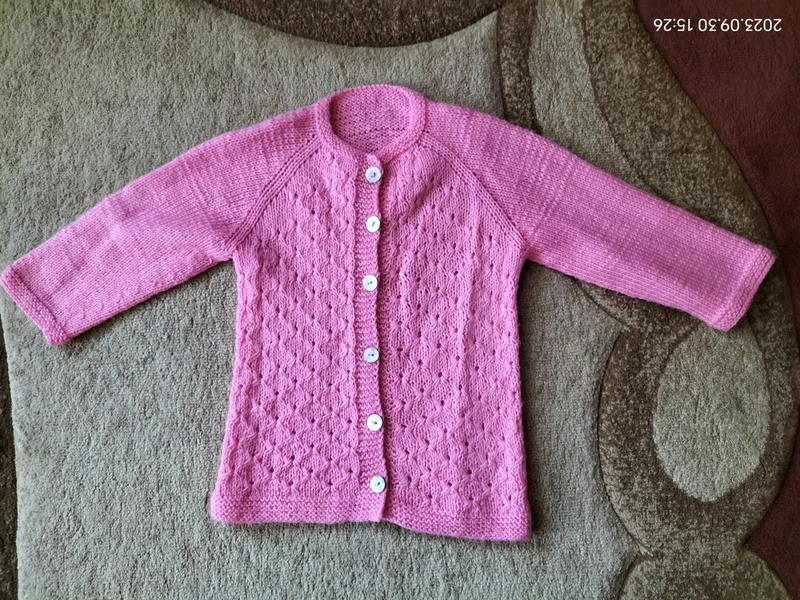 Кофточка в стані нової речі. Заміри: довжина 40 см, напівокружність грудей 29 см, довжина рукава від горловини 38 см, по внутрішньому шву рукав 22 см.