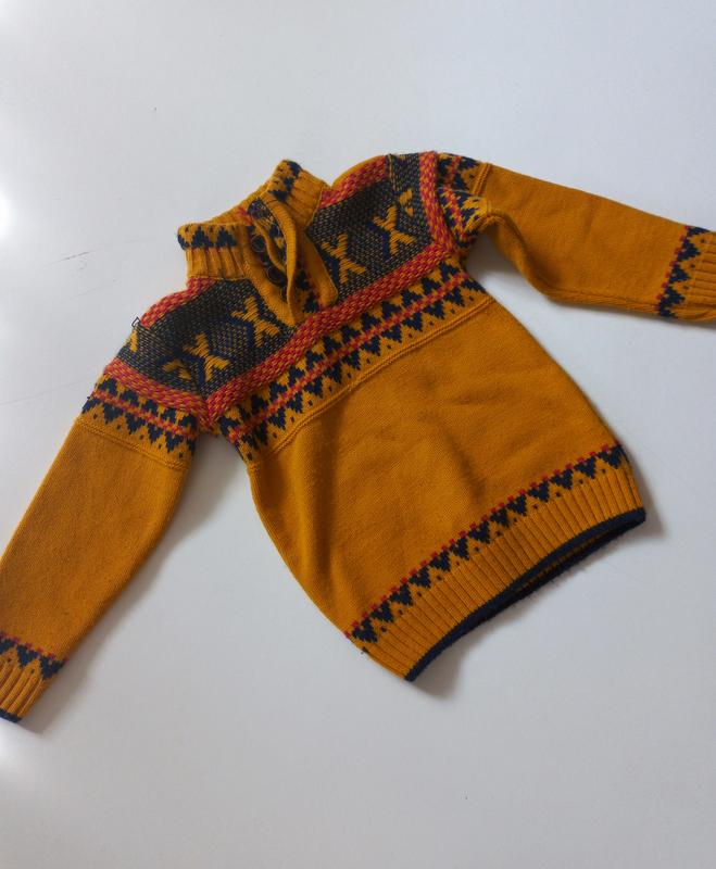 Тепленька кофта, гірчичного кольору. Підходить для хлопчика 3- 5 років. Заміри: Довжина кофти від плеча - 41 см Довжина рукава - 34 см Ширина - 30 см.