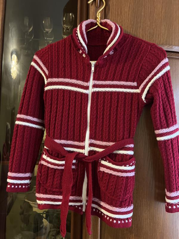 Тепла кофтинка на змійці, з кишенями та з поясом. Трикотаж Колір: бордо Заміри: по спинці - 53 см рукав від плеча - 50 см