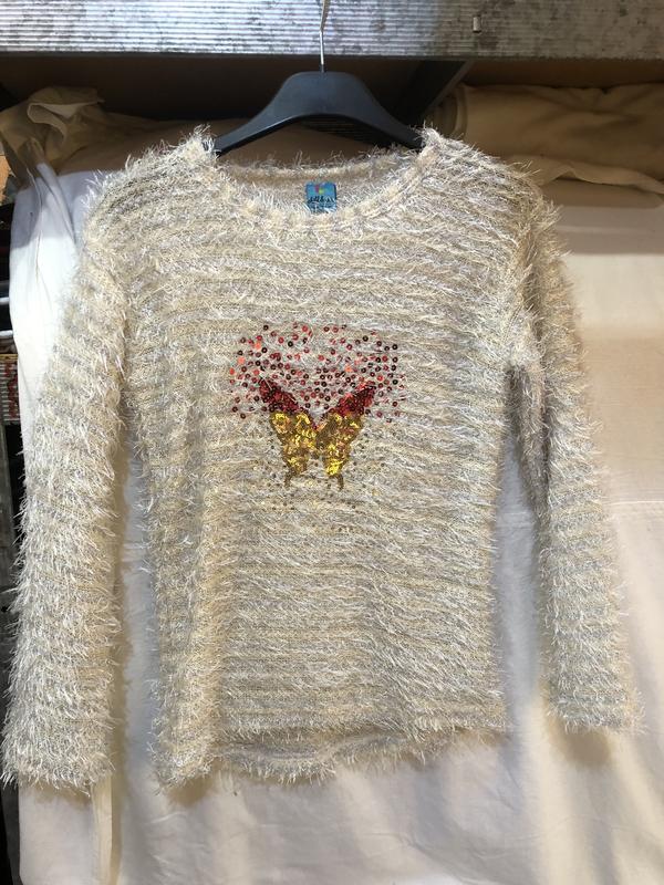 Трикотаж-травка з вкрапленням блискучої ниточки та метеликом з пайєток. Заміри: довжина 52 см півобхват грудей 37 см рукава 47 см довжина плеча 11 см