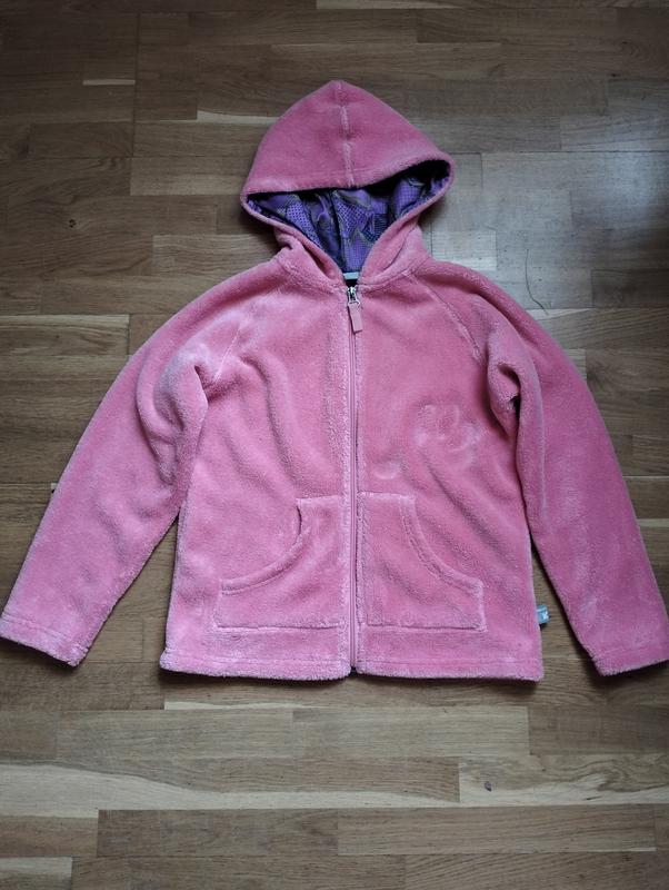 Теплюща кофта з капюшоном на 7-10років. М'якенька, колір персик+корал. У бездоганному стані. Носили мало. Якість супер. Підійде і на зиму, як кофта на теплу весну і холодне літо, як вітровка. Заміри на фото. Дорога презентабельна річ.