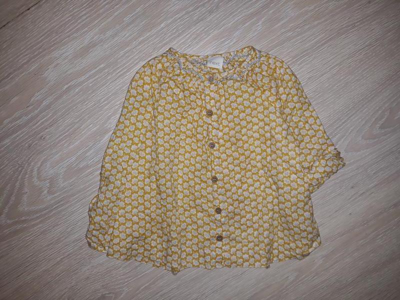 Фірмова сорочка, блузка для дівчинки на 2-3 роки. Попереду застібається на ґудзички, рукав робиться три чверті і фіксується ґудзиком. Склад 100% бавовна. Стан відмінний Виміри: довжина по спинці від плеча 37,5 см, ширина між пахвами 31 см, рукав від коміра 36 см, по внутрішньому шву 24 см