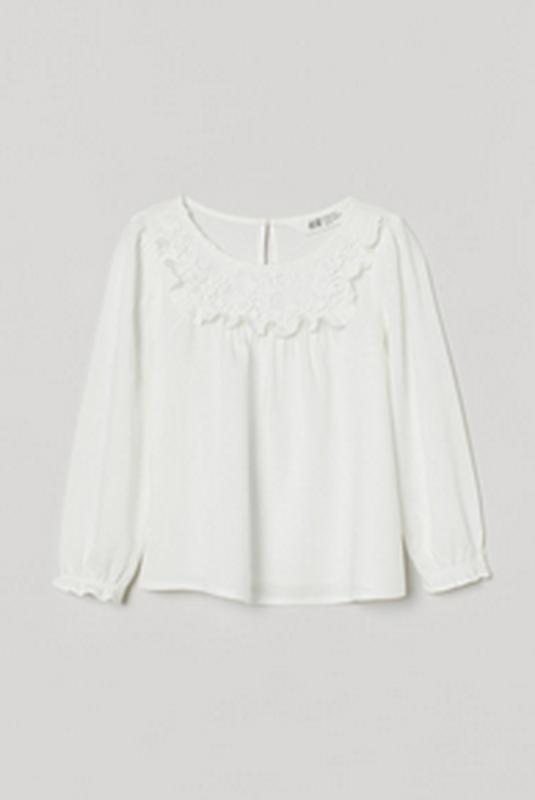 Фірмова, біла блуза на 5-6 років з віскозного трикотажу з застібкою на ґудзики і мереживною кокеткою спереду. Довгий рукав із зібраними швами на плечах і вузькою резинкою на манжетах, закруглений поділ. Злегка подовжена ззаду. Склад 100% віскоза. Стан відмінний, але дві темні крапочки, легко відперуться Заміри: довжина по спинці від плеча 40 см, ширина між пахвами 34,5 см, плечі 26 см, рукав від плеча 39,5 см, по внутрішньому шву 29,5 см