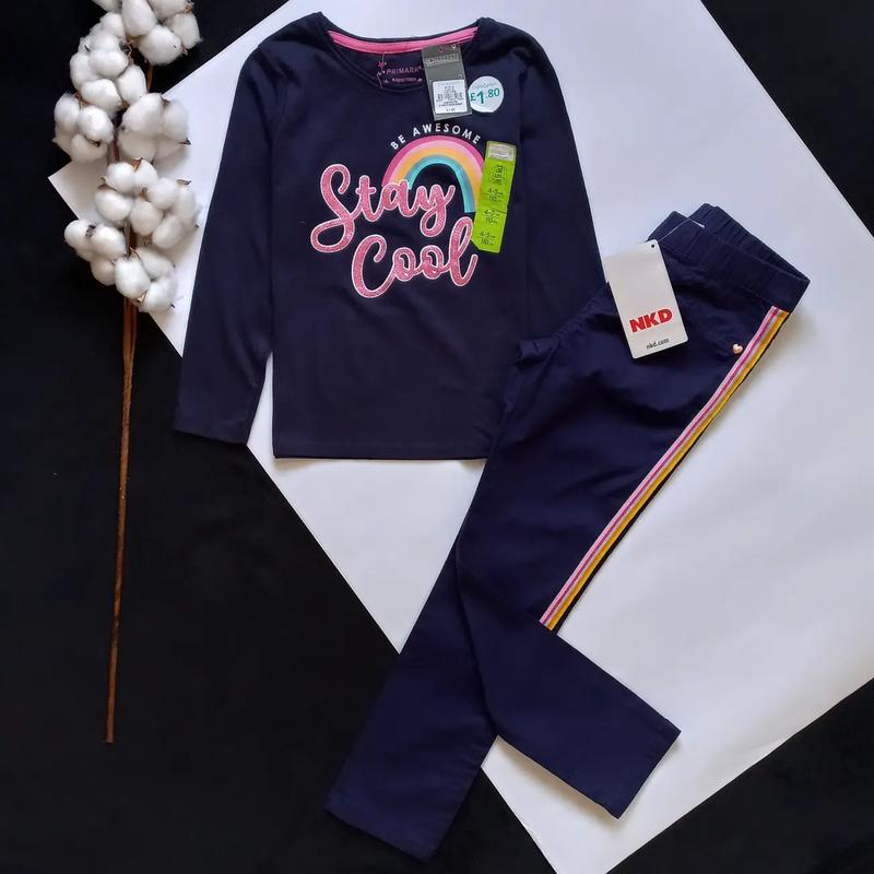 Лонгслив темно-синій з принтом веселки, блискуча ✔️ Primark ✔️ 4-5р ✔️ НОВА ✔️ дов-41,шир-31, руки-37 ✔️ Брюки темно-сині з різнокольоровими ломпасами ✔️ NKD ✔️ 110-116зріст ✔️ НОВІ ✔️ дов-65,крок-50,пояс-26 резинка