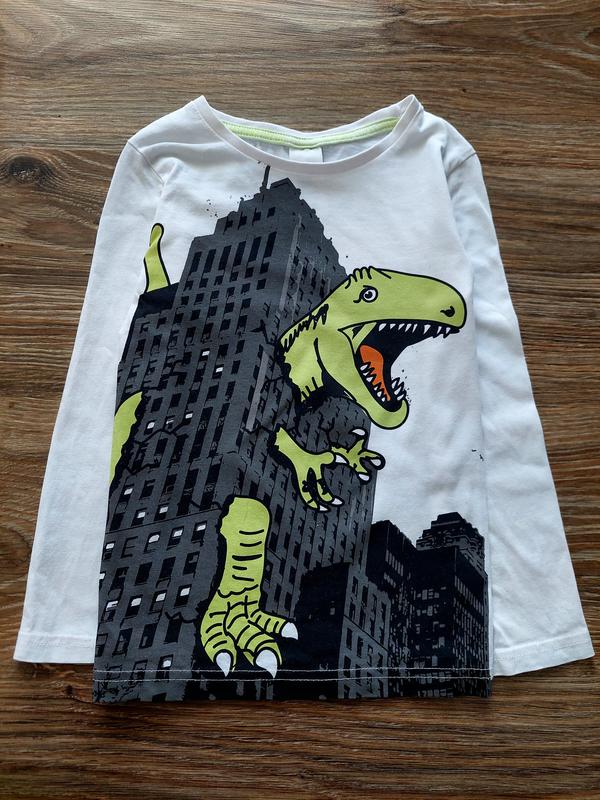 Гарна тонковка з бавовняного матерілу. Спереду принт динозавра. Стильна і яскрава. Біленький колір в ідеалі, не застіраний. Розмір на 6 років, зріст 116 см ПОГ - 34 см Довжина - 44 см Рукав від коміра - 43 см
