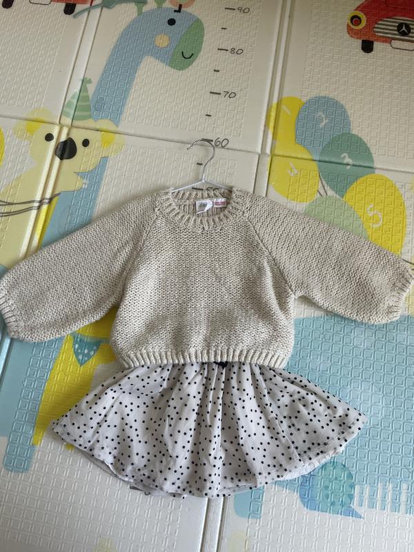 Стильный комплект Zara!Кофточка пишет 12/18 мес.(но лучше ориентироваться по замерам) длина 31 см,рукав 29 см, пог 32 см)рукав и ширина самой кофточки должны быть свободны! Юбка указана 3/4 (лучше по замерам) длинна 24 см,пояс 20 см (резинка супер) тянется )все в отличном состоянии!