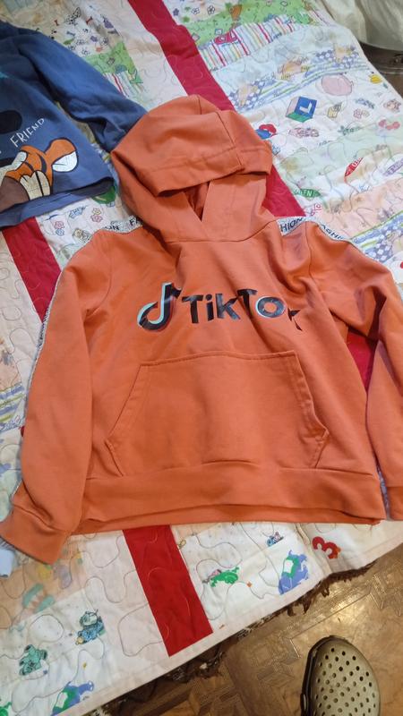Кофта с капюшоном.Оранжевого цвета.На рукавах со стороны вставки блестящие.Больш идет для девочки