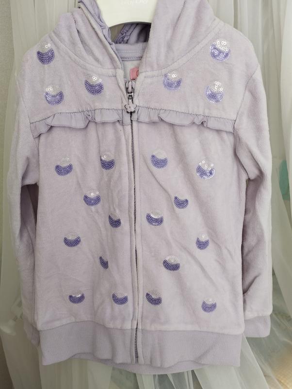 Кофта OVS з капюшоном на дівчинку 5-6 років. Колір яскравіший, ніж на фото. Тканина м'яка, як плюш. Дефект - на собачці трішки залізла фарба (є на фото). Довжина 44см, ширина 32см, рукав 41см.