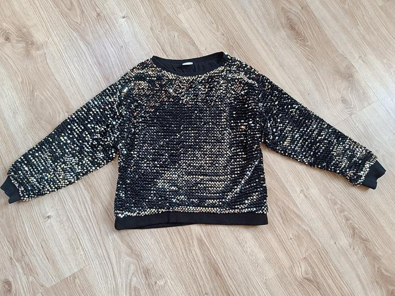 Стан нової речі, шикарна якість, тканина приємна до тіла, гарно тягнеться. Паєтки двусторонні, гарно переливаються. Довжина 52 см, рукав від горла 59 см, під пахвами 46 см.