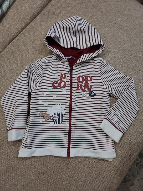 На 7 років.- зріст 122 см. Стан відмінний. З натуральної тканини на тоненькій баєчці. Склад -58 % котон,.Капюшон на бавовняній підкладці, є бокові кішеньки, по боках маленькі розрізи.