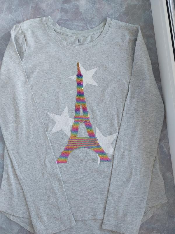 Реглан GAP на дівчинку як новий. Був куплений в фірмовому магазині. Якість чудова, пайєтки перегортаються, з одного боку золотисті, з іншого різнокольорові. Розмір дитячій xl, по розмірність сітці бренду це 145-155 см. заміри є на фото. буду виставляти ще реглани цього бренду, дивіться мої об'яви.
