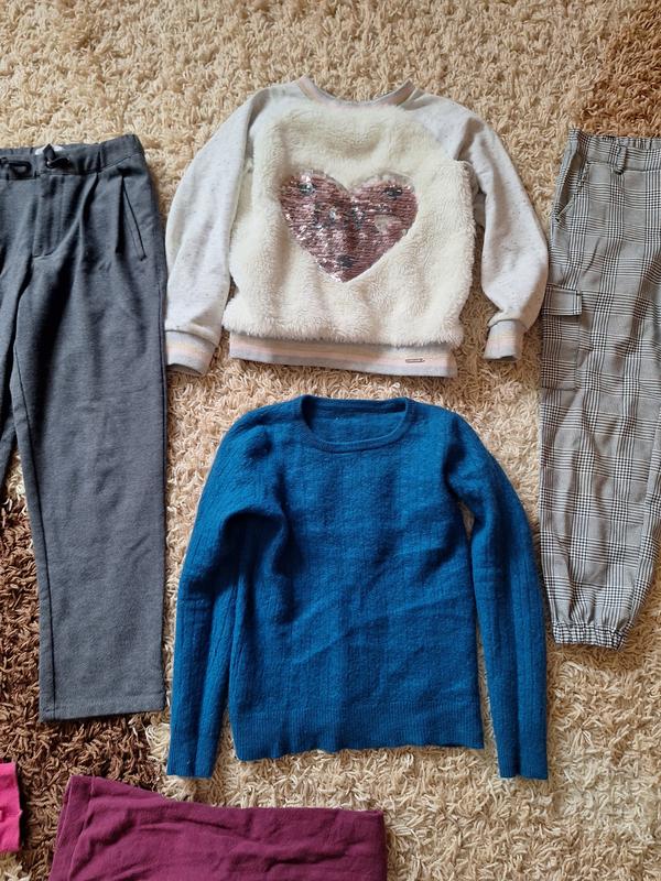 Пакет вещей для девочки р. 140. 9 позиций. теплая тоника, стрейчевые черные штаны, серые теплые брюки Zara, 2 тёплых кофта брюки карго , 3 шт. колготки.