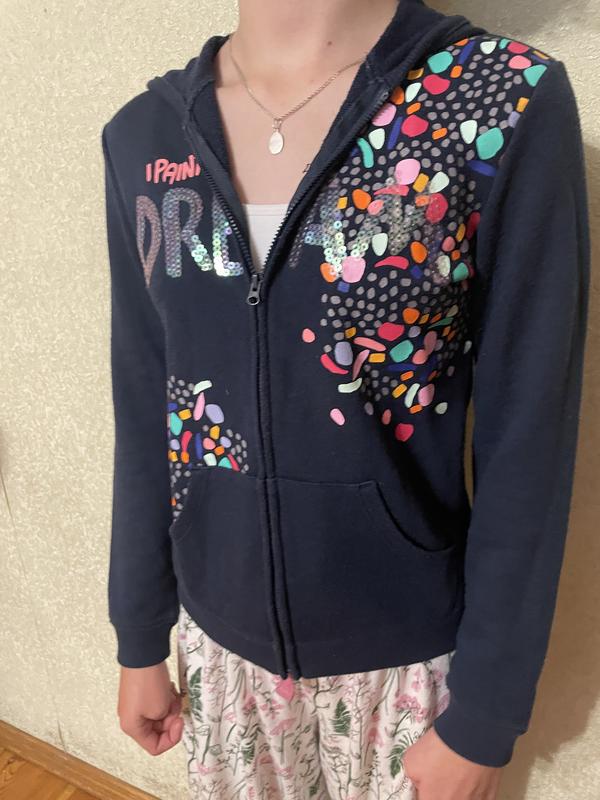 Кофтинка на замок с интересным принтом, имеет маленький начос Стан - идеальный Размер 146 Замеры: Длина-51 см Пог-38 см Рукав-52 см