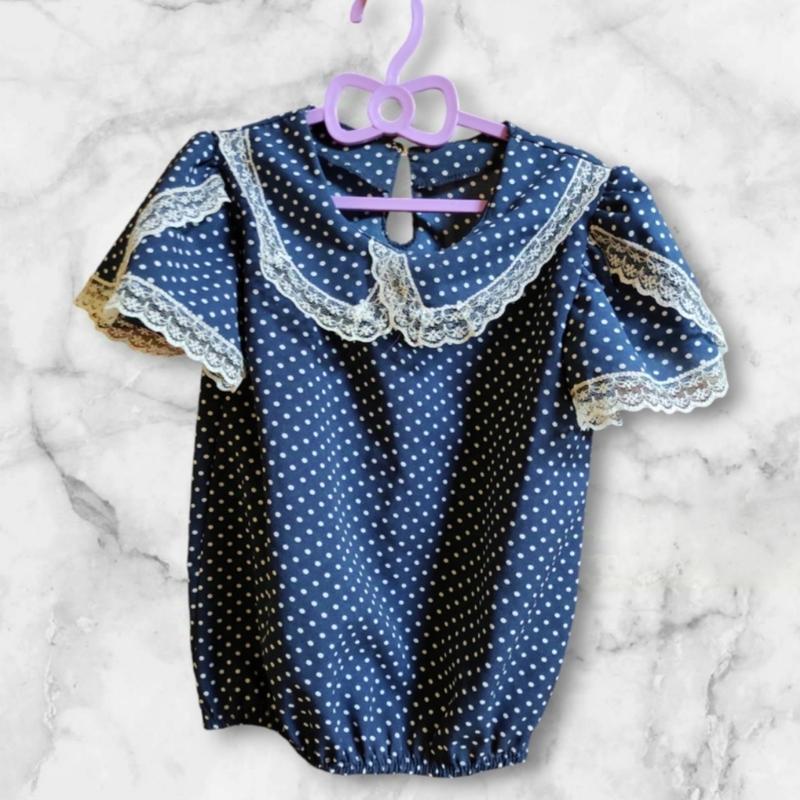 Кофточка из шифона с сетевыми оборками. Цвет синий в белый горошек. Бирок отсутствует. Низ кофтинки на гумці. На рост до 122 см.