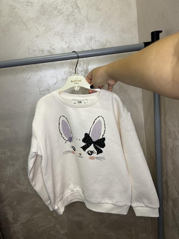 Милая кофточка с рисунком зайчика на девочку Размер: 6-рочков (рост -116см) Ширина -41см длина рукава от шва -37см Состав: 60% хлопок 40% полиэстер
