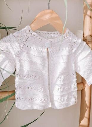 Чудова літня кофтинка, зв'язана вручну з м'якенької, як хмаринка, бавовняної ниточки. Гарно підійде у прохолодний день чи у вечірню пору. Рукавчик 3/4. Розмір - на дитинку віком 6-10 місяців, на зріст 68-80 см