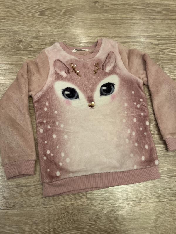 Кофта новорічна з оленем, h&m, зріст 122/128, ніжно-рожевого кольору з пайетками. Плюшева.