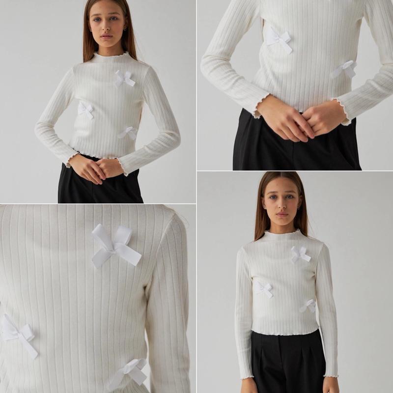 Лонгслів тканина мягкий трикотаж гарноі якості,хіт сезону - трендові бантики. Заміри-довжина/ пог /рукав 134-39/30/55 140-40-32/56 146-43/34/60 152-43/36/62 158-45/37/64 164-46/39/66