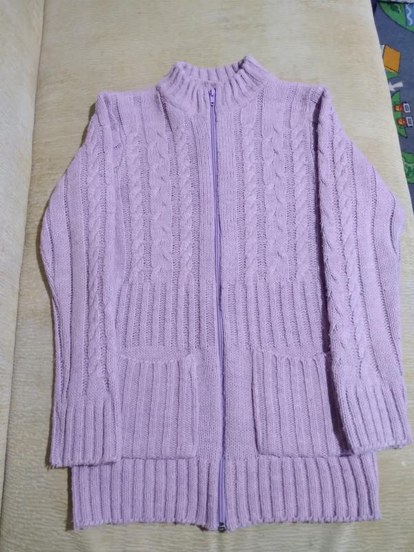 Тепла кофта на дівчинку р.134, у гарному стані, плечі 32, ширина 35, довжина 59, рукав від плеча 50 і підвернути манжет як потрібно, світло-фіолетового кольору, на струнку дівчинку. Пересилка Укрпоштою накладеним платежем