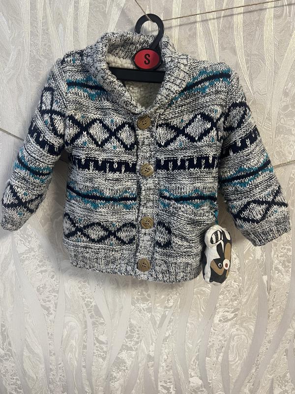 Вʼязана тепла дитяча кофта на 9-12 місяців (74-80 см) на пуговичках , є один карман на ньому є маленька іграшка .