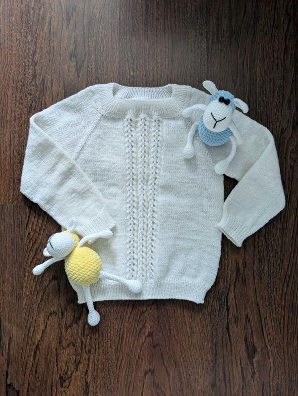 Красива дитяча кофта білого кольору, тепла, зроблена в одному екземплярі (ручна вязка спицями). Підійде як для хлопчика так і для дівчинки. Розмірна сітка для дитини 3-4 років, але орієнтуйтесь на заміри: ширина по грудях 37 см, довжина виробу по спинці 46 см. Одягайте своїх діток у красиві та якісні речі! Можливий повтор у будь якому кольорі і розмірі