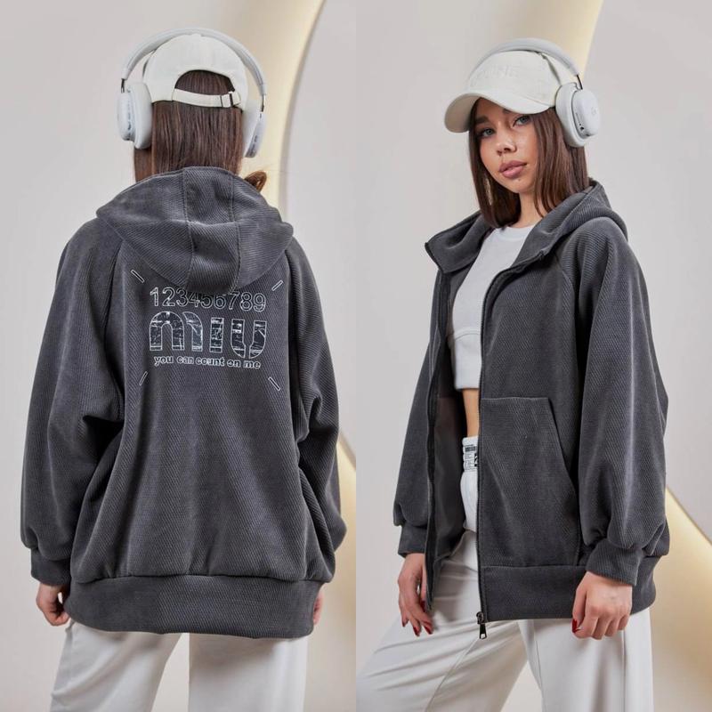 Зіп-бомбер ОВЕРСАЙЗ з капюшоном на утяжці на блискавці по спинці сучасний накат є кишені тканина щільний вельвет-діагональ на трикотажній основі Може бути замість весняної куртки Шикарна якість! зріст/довжина/пог/рукав від горловини похибка+-2см 140-146/62/60/58-1шт 146-152/63/61/60-1шт 152-158/64/62/62-1шт