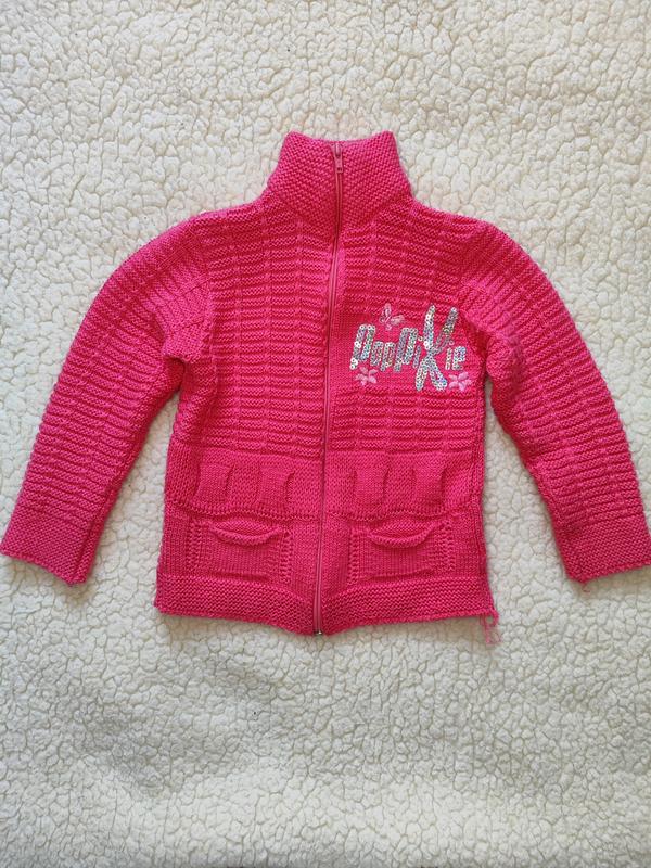 Кофта для девочки Состояние: идеальное На возраст: 4 года На рост: 104 см Сезон: Весна, осень, зима Материал: 70% хлопок, 30% полиэстер Замеры: Длина: 39 см Ширина по груди: 31 см Ширина по плечам: 31 см Длина рукава от плеча: 35 см