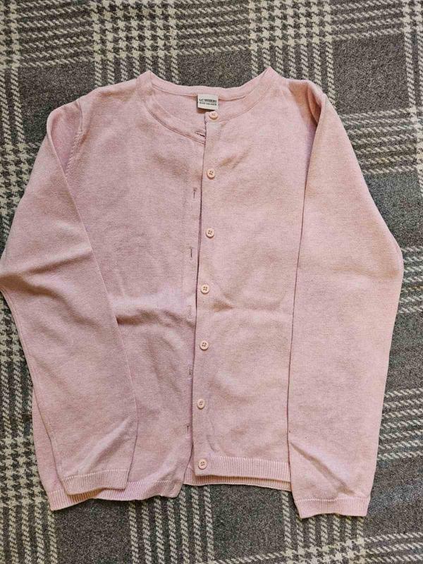 Классическая кофта на пуговицах для девочки в отличном состоянии. Очень нежный розовый цвет. Идеально для школы. Материал 100% хлопок. Рост 140-146см. Производство Бангладеш