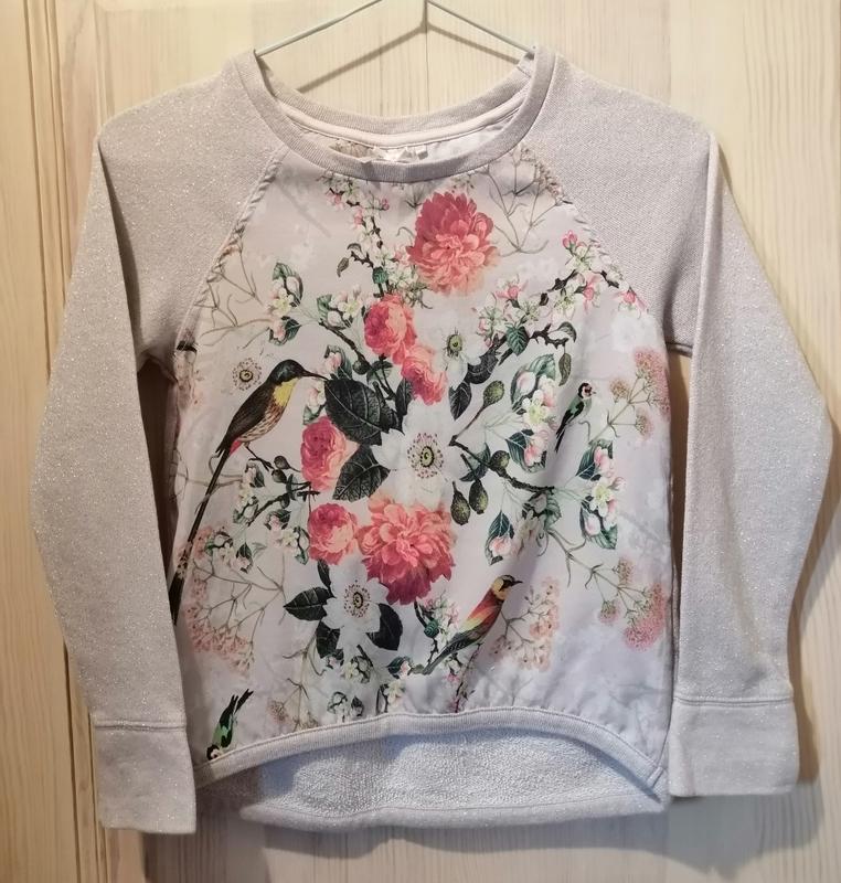 Нежная кофточка на рост 134 см. С люрексовой нитью, спереди ткань тоненькая с принтом. Стан красивый, замеры: длина 49, рукав от плеча 55, под руками 36.