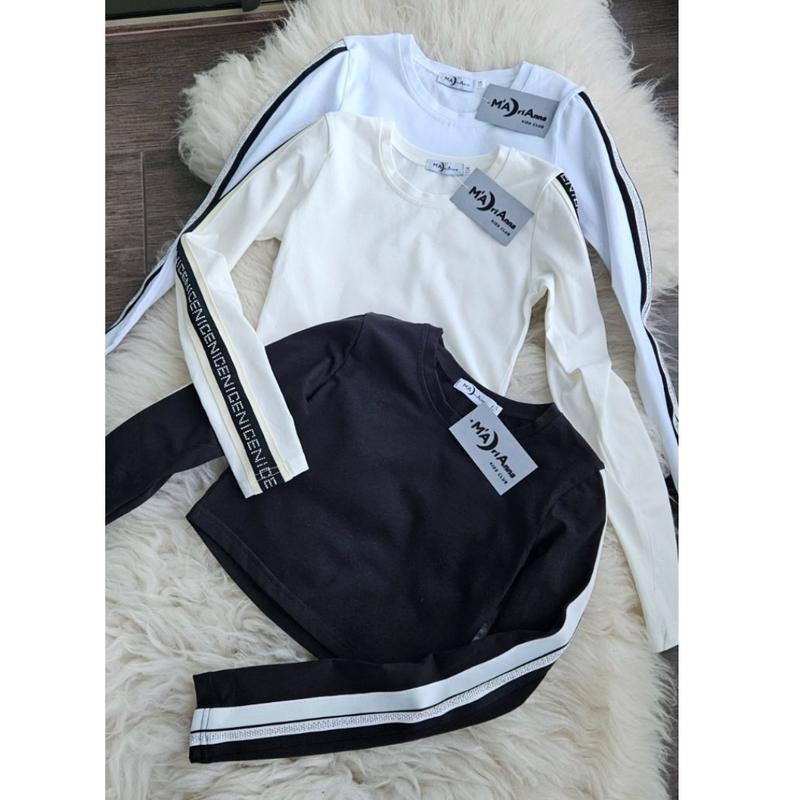 💝Укорочений лонгслів з полосками на рукавах 🏷Розміри: 134-164 🪡Тканина: стрейч кулір, є отвір на пальчик. Чудовий весняний варіант до штанів, джинсів, спіднички. Гарно тягнеться Арт кк