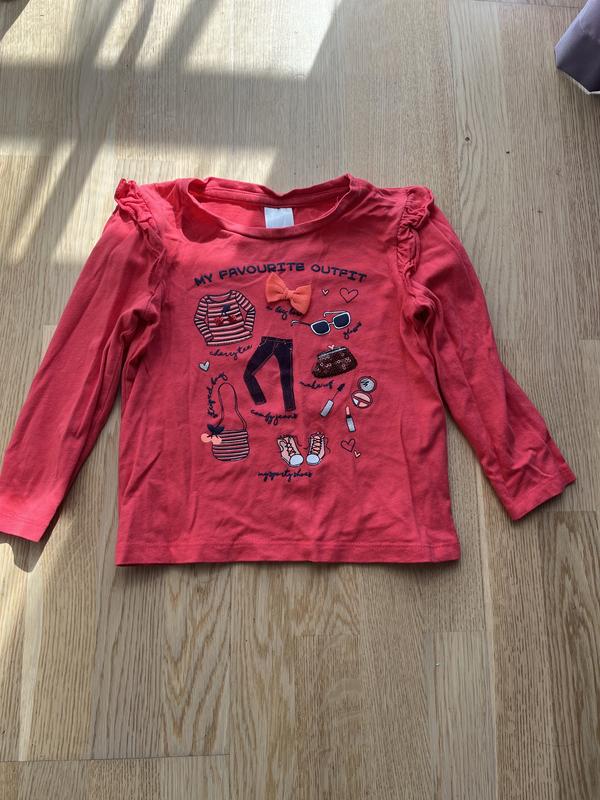 Кофтинка для дівчинки в ідеальному стані, кілька разів одягалась. Довжина - 33 см, ширина у грудях - 28 см. На рукавах згори - крильця рюшки, кофта оздоблена паєтками, вишивкою, малюнками і написом