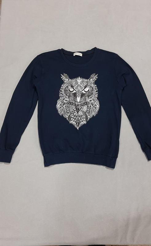 Кофта светр із принтом сова. Колір темно-синій. Розмір 42-44. Довжина 56 см, напівобхват грудей 44 см, довжина рукава 55 см.