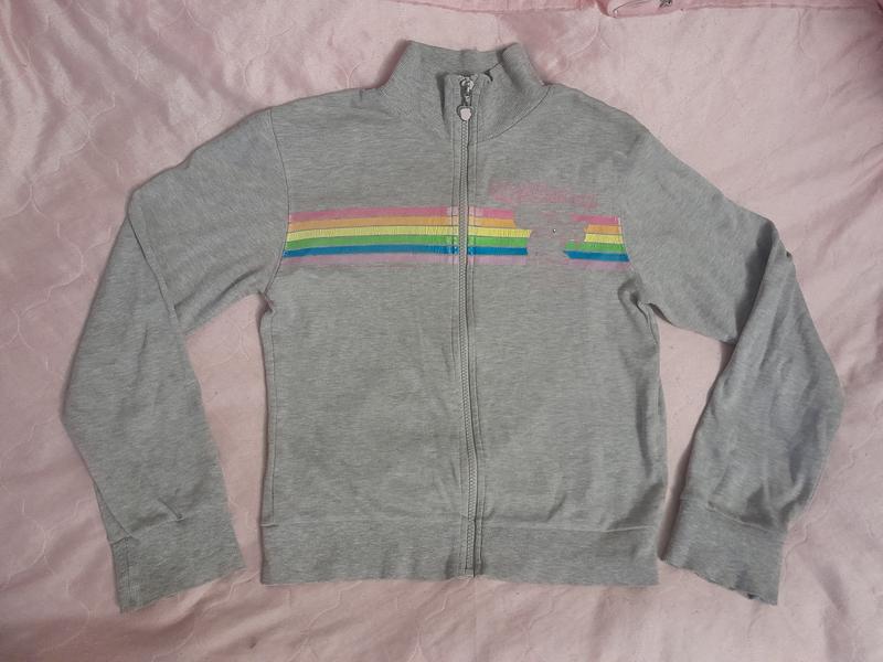 Спортивна сіра кофта, на тонкому флісі, без капюшона. Заміри на фото Розмір вказаний на 11-12 років і на зріст 146-152, але й підійде на дівчину на XXS-XS Склад 70% котон, 30% поліестер Стан гарний, але є дефект там від прання потріскалася фарба, дивіться на останній фото Оплата тільки на карту, а якщо Ви хочете безпечної оплати, то під час отримання посилку забираєте. Перешлю будь-якою поштою Дивіться всі свої оголошення🫶