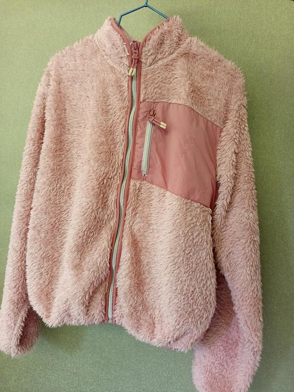 тепла зручна кофта рожевого кольору, з комірцем та нагрудним карманчиком в районі серця.