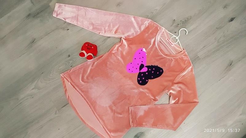 Нарядная велюровая кофточка-туничка с удлиненной спинкой . Очень красивая, украшены пайетками-перевертышами. Длина по переду-58,5 см., по спинке-66 см., ширина под проймочкой-40,5 см., рукав-55 см. Смотрится модно и стильно.