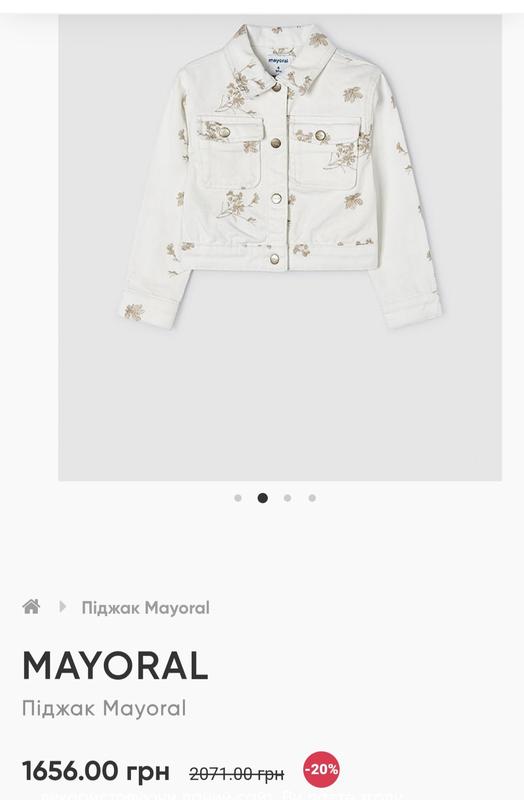 Джинсова куртка від Mayoral для дітей 5 років. Колір - білий. Розмір 110. По всій курточка вишивка. Купили уже пізно і вона була впритик одягли разів два. Минулорічна колекція , фото з сайту додаю щоб видно було ціну нової.