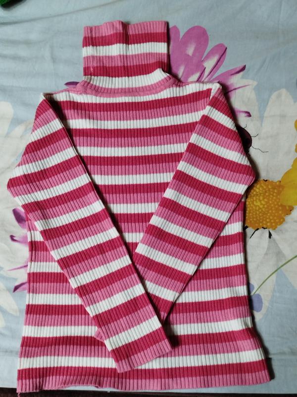 Дитяча кофта в рубчик з високим горлом Продам яскраву дитячу кофту в рожево-білу смужку. Модель з високим коміром, довгими рукавами та зручним прилягаючим кроєм. Матеріал — м’який, еластичний трикотаж у рубчик, дуже приємний до тіла. Підійде для прохолодної погоди — осінь, зима, весна. Розмір: приблизно на вік 7-8 років 120-128 см Стан: відмінний, без плям, затяжок чи пошкоджень.