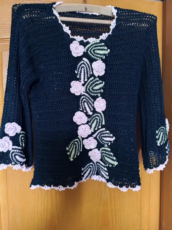 кофтина в'язана для дівчаток, квіти об'ємні, довжина рукава від горловини 54см, довжина виробу 52см, ширина низу 45см, тягнеться