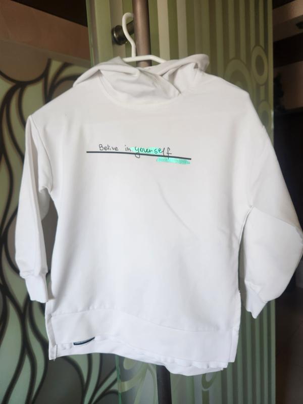 Білий светрик на дівчинку з капюшоном на ріст 128 см, є невеличка пляма від ручки, і жовтава майже не помітна на рукаві