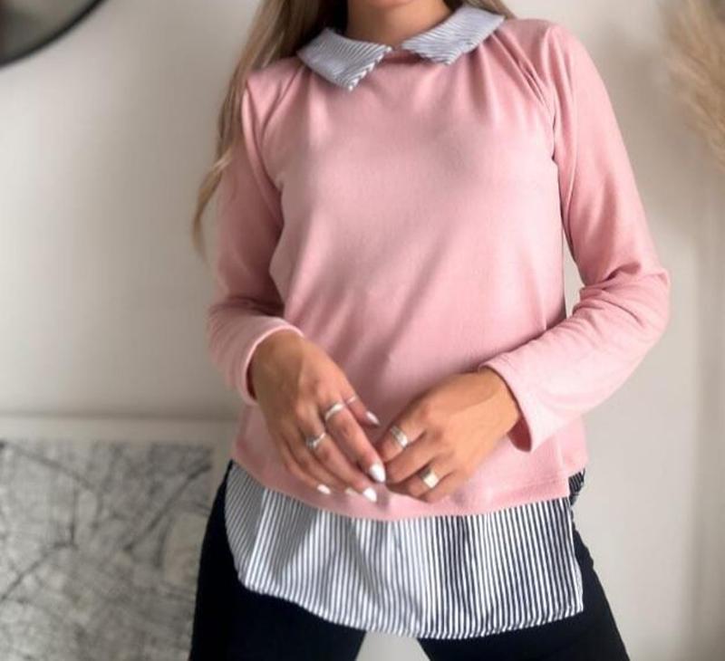 На фото девочка 13 лет ростом 157см ПОГ - 42 см плечи - 34,5 см длина общая( розовое+обманка в полоску) -55см Ткань дайвинг+коттон Без етикеток