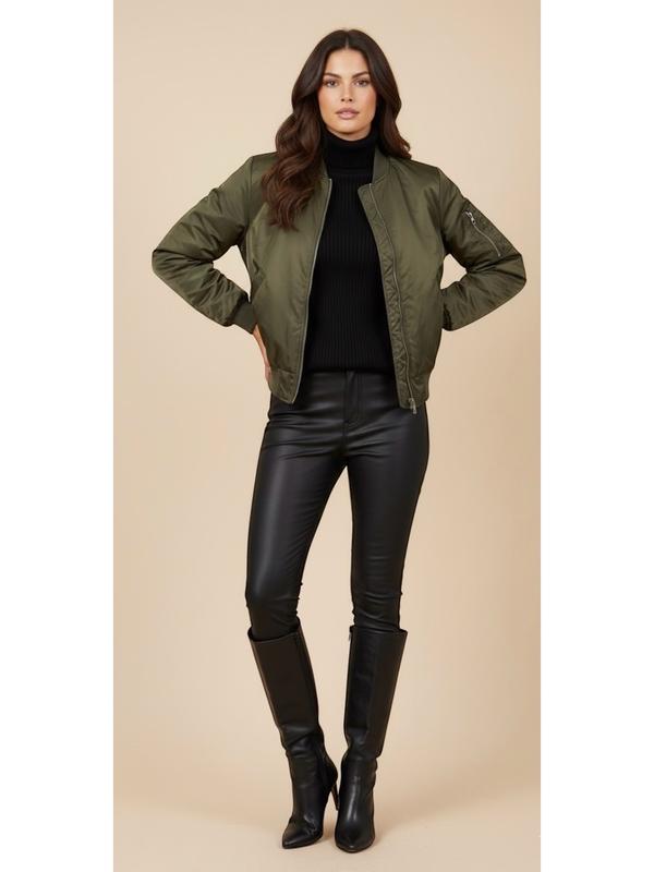 оливково-зелена куртка-бомбер з довгими рукавами, коміром-стійкою та застібкою-блискавкою. Вона також має кілька кишень на блискавках. Довжина 58 Рукав- 55 Пройма- 55