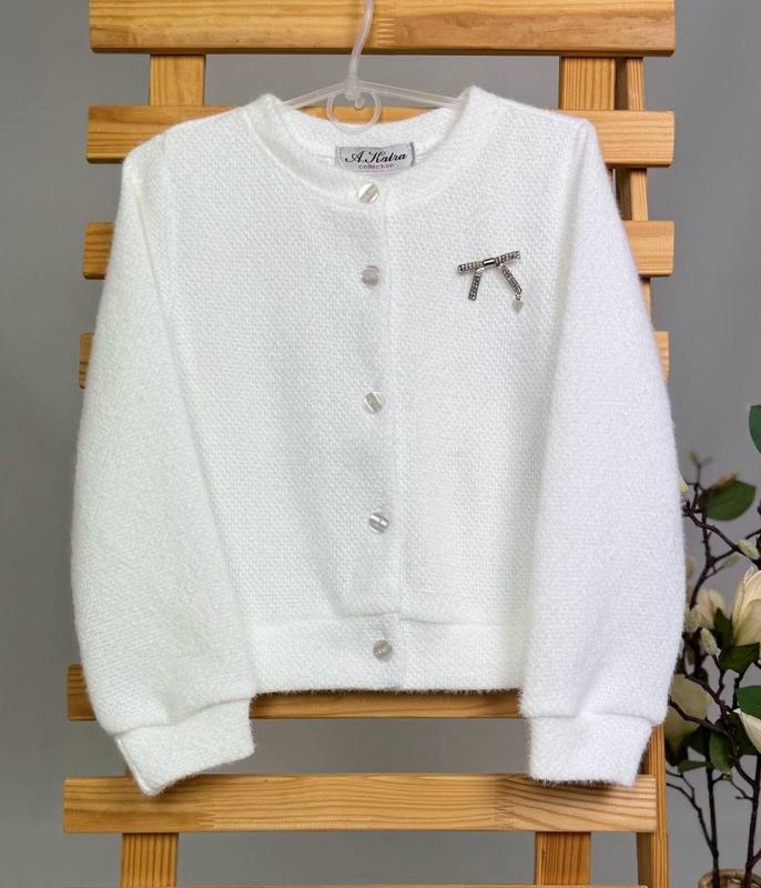 Стильна та практична кофтинка застібається на гудзики. Брошка знімається йде в комплекті, може відрізнятися. Тканина - Альпака, тепла та м'якенька. Гарна якість! довжина/ рукав/ пог 122 - 40/ 42/ 36 128 - 42/45/37 134 - 44/45/39 140 - 45/48/40 +- 1-2 см