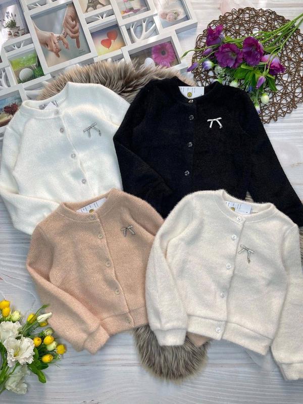 тепла кофтинка для красунь тканина альпака, м'яка і приємна на дотик застібається на гудзики брошка в комплекті Колір чорний Заміри: довжина/ пог/ рукав від плеча 122 - 37/ 36/ 40 128 - 39/ 38/ 44 134 - 41/39/45 140 - 41/39/49